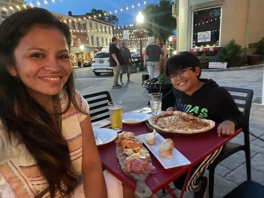 There are two moments during our NY trip that I remember feeling so happy. The first was dinner outside at a local restaurant in Goshen NY. It was a perfect setting with live music in the background and perfect weather. The second was early dinner on what felt like a secret garden on our way to the Brooklyn bridge. I remember feeling a deep sense of joy being outside enjoying the scenery.