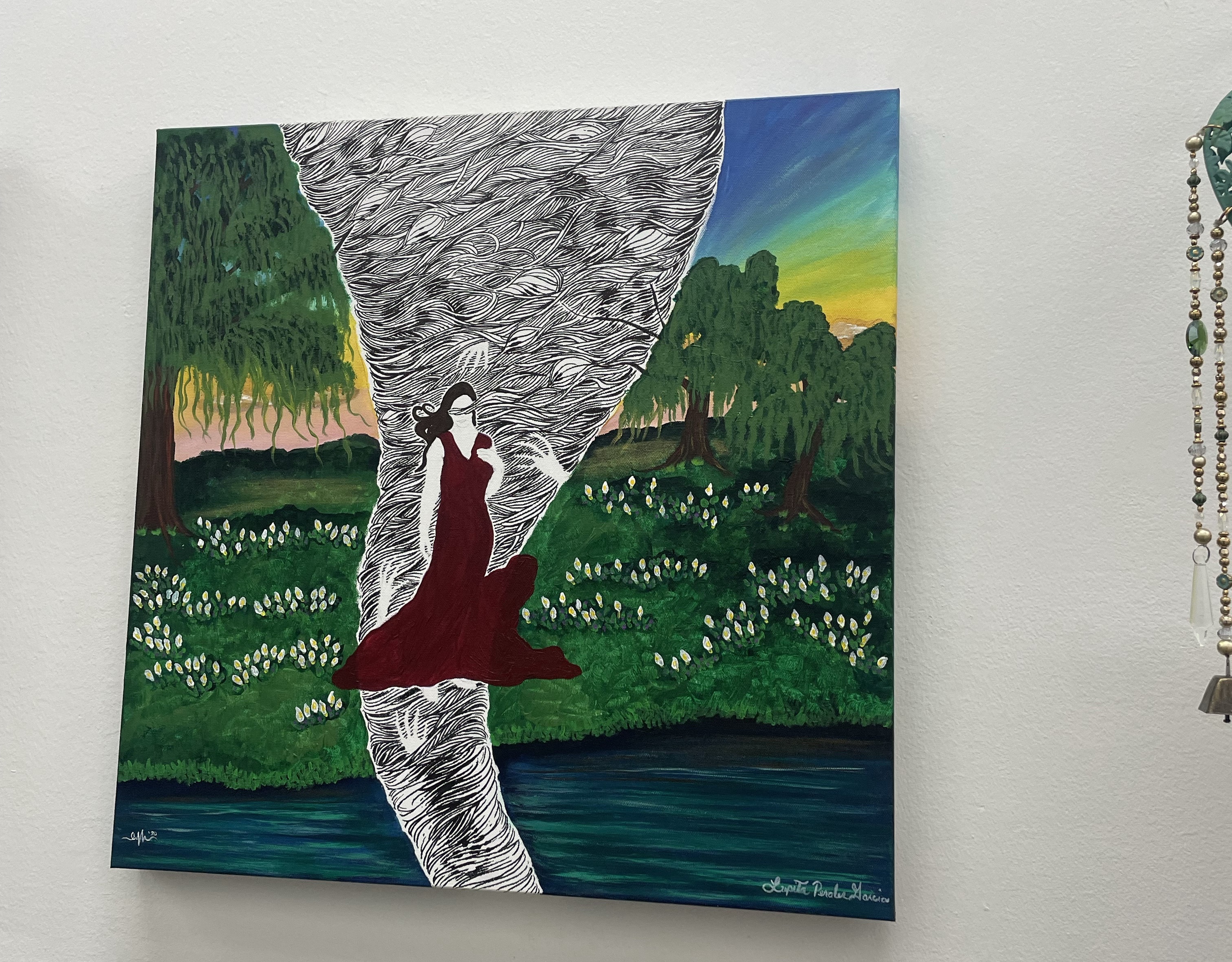 I went back to the gallery and purchased the painting weeks after I saw it. Lupita Peralez-Garcia, the artist explained her inspiration and the fact it’s collaboration piece with another artist, Erik Martinez. It hangs on my wall at home and it’s one of my favorite pieces.