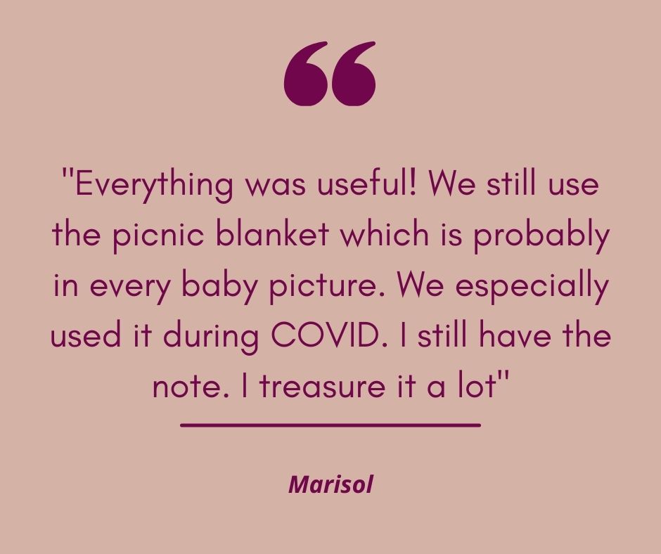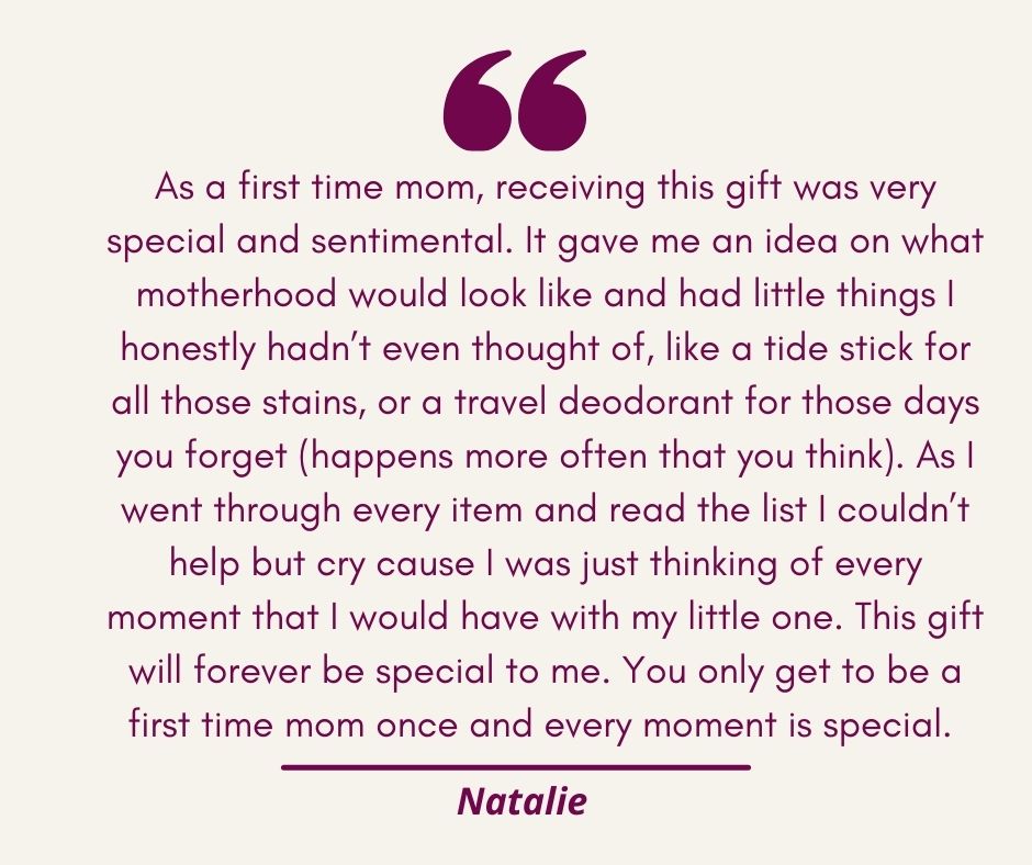My favorite gift after Gael was born came from a boss that became a great friend! Kelly, a mom of two boys, came by to visit me and brought me an unexpected gift. The gift she brought didn’t include any gifts for the baby. Instead, everything was for me. She included a few items to ease breastfeeding, drinks to make sure I was hydrating while doing it, and snacks. She said, “because there will be times you will forget to eat.” This was by far the most thoughtful gesture and one I never forget.